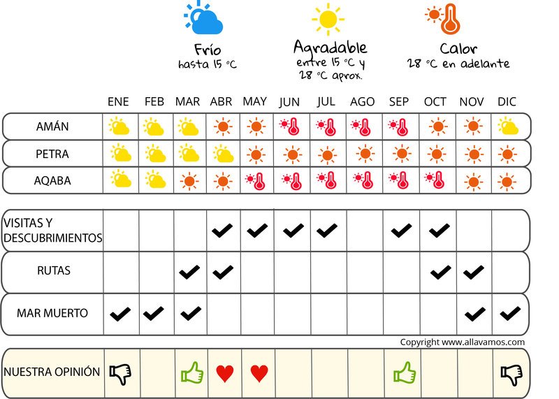 Por lo tanto, la mejor época para visitar Jordania en términos de clima puede variar según sus preferencias. Si busca pasar la mayor parte de su tiempo al aire libre, entonces la estación cálida de abril a octubre podría ser una buena opción para disfrutar del tiempo soleado. Sin embargo, si prefiere pasar la mayor parte de su tiempo explorando los lugares históricos, entonces el invierno sería un mejor momento para visitar Jordania. Durante esta época el calor no es tan intenso, lo que le permite pasar más tiempo en interiores sin sufrir por el calor.
