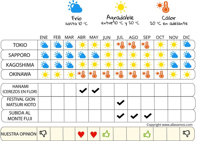 Japón es un país con un clima muy variable y cuenta con cuatro estaciones muy marcadas. Las temperaturas varían mucho según la época del año, así como la cantidad de lluvias.