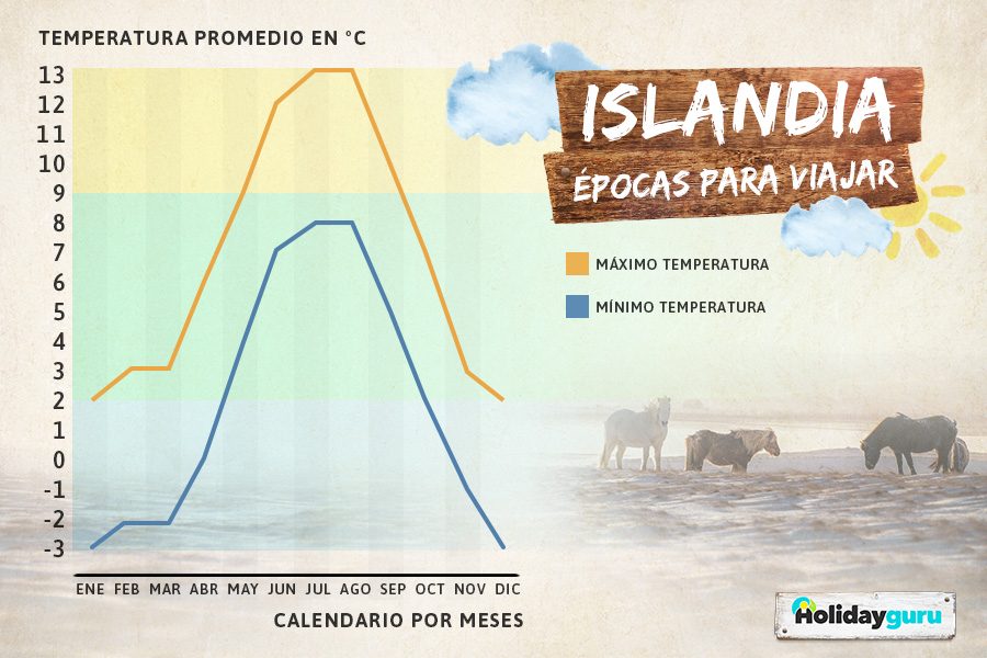 El invierno es el momento ideal para aquellos que buscan disfrutar del eterno día blanco de Islandia, ya que los días son más cortos. La temperatura media se encuentra entre -2°C y los 3°C, por lo que es recomendable llevar ropa abrigada.